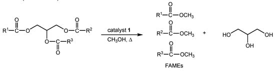 The procedure is similar to that adopted in a previous work [4]. A 10 mL screw cap glass vial equipped with a magnetic bar was charged with methanol (4 mL), soybean oil (0.5 mL, 415 mg), and the proper amount of catalyst 1. Then, the vial was sealed and heated under stirring at the proper temperature. After the reaction, the mixture was cooled to room temperature, transferred into a centrifuge tube, and subjected to 3500 rpm for 15 min. The catalyst layered to the bottom, while the surnatant organic phase was recovered by pipette. The catalyst was washed with 2 × 4 mL of pure methanol and dried at 50 °C promptly to be reused. The washing phases and organic surnatant were combined, the solvent removed by evaporation and re-dissolved into 5 mL of ethyl acetate. Then, 100 μL of hexadecane (standard) were added for GC-MS analyses.