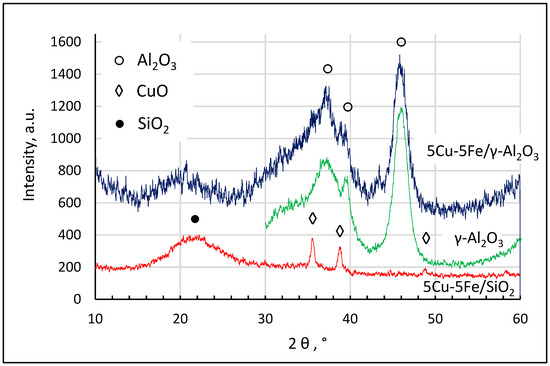 Figure 1 shows the XRD profiles of different Cu-Fe catalysts after calcination at 300 °C for 4 h. The X-ray profile of the bimetallic sample deposited on SiO2 shows two main reflections at 2θ = 35.6° and 38.7° and low-intensity reflection at 48.4°, which correspond to the characteristic diffraction lines of crystaline CuO, in agreement with the JCPDS card no. 45-0937. No iron-containing phases were detected for either sample, probably due to the high dispersion of iron oxide particles or their amorphous nature. For the sample deposited on γ-Al2O3, only main diffraction lines are present at 2θ values of 37.5°, 45.8°, and 67.2°, as well as the rarely observed line at 39.5°, which can be attributed to the γ-Al2O3 structure according to the JCPDS card no. 51–0769. The reason for the absence of any deposited metal oxide phases on this sample may be the overlapping of the carrier reflections with the reflections of copper and iron oxide phases.