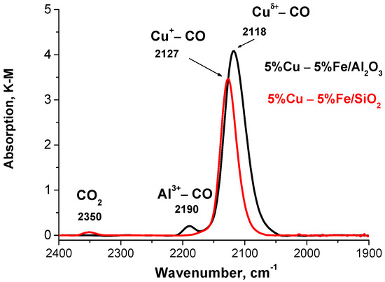 For the catalyst 5%Cu-5%Fe/Al2O3, the intensity of the band was enhanced substantially, and the position shifted to a low wavenumber, namely to 2118 cm−1, compared with that on the 5%Cu-5%Fe/SiO2 sample (Figure 2). The band at 2118 cm−1 characterizes linear carbonyl on electron-deficient copper cations (Cuδ+-CO) [26]. The presence of this band likely indicates strong interaction of copper and iron species in the 5%Cu-5%Fe/Al2O3 sample, which is also consistent with the TPR-H2 results for this catalyst (to be discussed below). The band position at 2190 cm−1 agrees with the assignment to CO adsorbed on Al3+ cations [27].