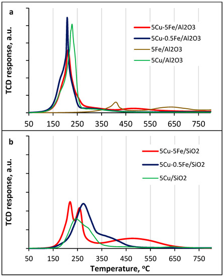 The SiO2-supported samples exhibited a different reduction behavior after calcination. The reduction temperatures for the Cu-Fe/SiO2 catalysts are shifted to the high-temperature region in relation to alumina-supported catalysts. The double peak of a lower intensity was observed on the TPR curve of the sample 5%Cu-5%Fe/SiO2 (Figure 3b) at the temperatures of 150–330 °C in the region of reduction of silica-supported CuO to Cu0 (maximum at 221 °C) and Fe3+ to Fe2+ (maximum at 260 °C). The peak in the range of 400–650 °С with a maximum at 492 °C corresponds to reduction of Fe2+ to Fe0. Thus, in a bimetallic iron-copper catalyst, there is a close contact interaction between the oxide phases of iron and copper, and the Cu0 phase contributes to an easier reduction of Fe2O3. A similar accelerating effect of copper on the reduction of Fe2O3 to Fe3O4 was described earlier [18,29].