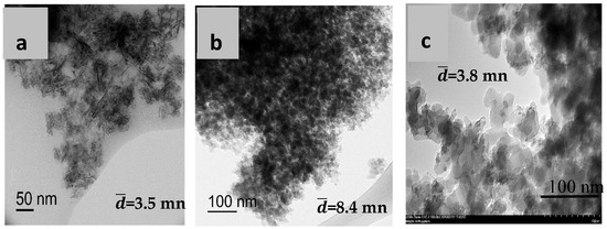 TEM analysis was conducted on calcined samples to obtain information on the size and microstructure of metal particles (Figure 4). It is interesting to note the effect of the support on the metal dispersion. The TEM study of the 5Cu-5Fe/Al2O3 catalyst revealed the more homogeneous distribution of metal particles, with a smaller average size (3.5 nm) and aggregates of particles with a size of 10–13 nm, while the sample of the same composition supported on SiO2 prepared by the impregnation method is characterized by the higher values with the mean particle size of 8.4 nm and particle aggregates above 20 nm. Additionally, in the 5Cu-5Fe/SiO2 sample, there are agglomerates of larger particles up to 20 nm in size in addition to small particles. It appears that the metal interaction with alumina is stronger than with silica, which is consistent with XRD results and the discussion above. A similar dependence of the influence of the carriers on the nanoparticle size was discussed earlier [30]. Additionally, the 5Cu-5Fe/SiO2 sample prepared by the DPU co-deposition method provides the formation of particles with a narrow size distribution with an average size of 5 nm.