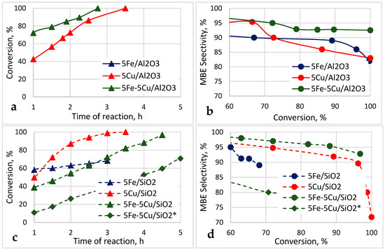 Time dependence of the MBY conversion (a,c) and the selectivity to MBE (b,d) for the 5Cu-5Fe samples supported on Al2O3 and SiO2 (*DPU method).