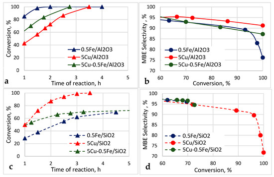 Time dependence of the MBY conversion (a,c) and the selectivity to MBE (b,d) for the 0.5Cu-5Fe samples supported on Al2O3 and SiO2.
