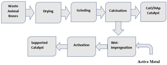 Calcination is performed within broad temperature range for instance, from 300 to 1000 °C, depending on the feedstock nature and type. At higher temperatures, carbonates in the organic compound will decompose into their oxides with the release of CO2. Figure 1 demonstrates the generic method for the manufacturing of CaO/HAp-derived catalyst and supported catalyst extracted from waste animal bones [].