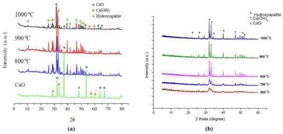 The catalytic surface area is a substantial role-playing factor in catalytic activity of any catalyst. The effect of calcination temperature on the surface area of catalyst is strongly dependent on waste source. For example, Farooq et al. [] conveyed that the surface area of uncalcined chicken bones was 5.25 m2/g. Upon calcination, the surface area of chicken bones derived catalyst began to rise. The highest surface area of 120.02 m2/g was observed at the calcination temperature of 1000 °C. On the contrary, the calcination of bovine bones derived heterogeneous catalyst above 650 °C did not indicate the significant improvement in catalytic surface area. That was merely 2–3 m2/g showing loss of pore volume and crystallite sintering []. In another study, Li doped chicken bones-based catalysts indicated reduction in surface area from 8.62 to 2.58 m2/g on the increment of calcination temperature from 750 to 900 °C. The reduction in surface area might be because of the sintering process and changing in phase crystallization []. In case of calcined sheep bones derived heterogeneous catalyst, substantial increase in surface area (from 6.8 to 885 m2/g) was observed with an increment in calcination temperature []. This variable trend of surface area with the calcination temperature may be due to the different methodologies bone preparation prior to calcination.