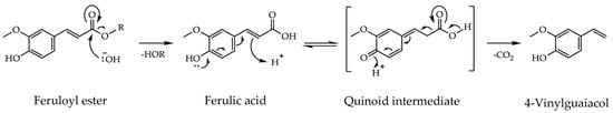 Reaction scheme of the hydrolysis of feruloyl esters to ferulic acid and subsequent decarboxylation via a quinoid intermediate and release of carbon dioxide to form 4-vinylguaiacol [15].
