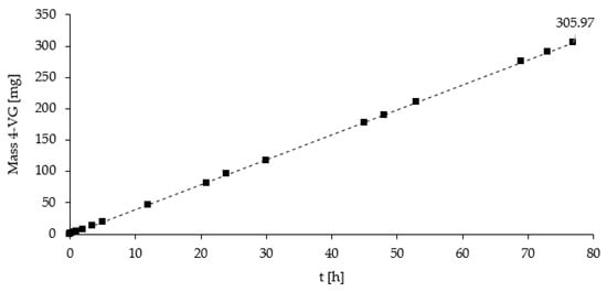 Process productivity graph. From the area under the curve of the 4-VG concentration from Figure 2a, the accumulated product mass after the respective reaction time was calculated.