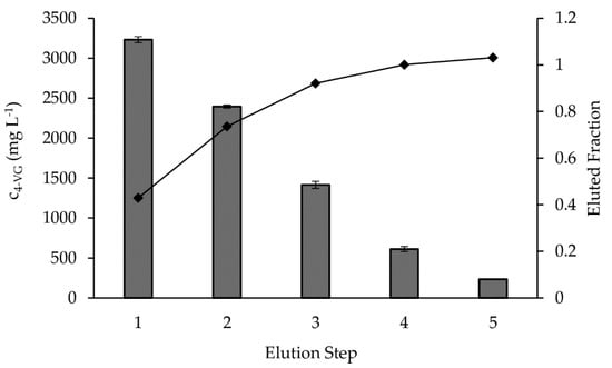 Elution of 4-VG from XAD4 after the process. Five consecutive elution steps using 200 mL 96% undenatured ethanol in total were applied, containing decreasing product concentrations (grey bars). The eluted mass was accumulated in each elution step and set in relation to the overall produced product mass of about 306 mg (Figure 3) (black diamonds). All samples were measured in triplicates.