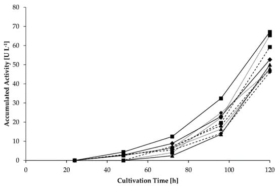 A maximum activity of 67 U L−1 was detected for the clone A, producing the fusion protein with the linker RRRR after 120 h.