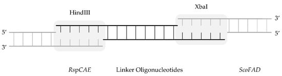 For each construct, the pre-digested genes of ScoFAD and RspCAE were ligated using two overlapping oligonucleotides coding for the respective linker residues. Thus, the oligosaccharides R_For 5′-AGCTTGAAGCTGCCGCAAAGT-3′ and R_Rev 5′-CTAGACTTTGCGGCAGCTTCA-3′ were applied for the cloning of the 1 × EAAAK variant, RR_For 5′-AGCTTGAAGCTGCCGCAAAGGAGGCAGCTGCCAAAT-3′ and RR_Rev 5′-CTAGATTTGGCAGCTGCCTCCTTTGCGGCAGCTTCA-3′ were applied for the cloning of the 2 × EAAAK variant, RRR_For 5′-AGCTTGAAGCTGCCGCAAAGGAGGCAGCTGCCAAAGAGGCTGCCGCAAAAT-3′ and RRR_Rev 5′-CTAGATTTTGCGGCAGCCTCTTTGGCAGCTGCCTCCTTTGCGGCAGCTTCA-3′ were applied for the cloning of the 3 × EAAAK variant, RRRR_For 5′-AGCTTGAAGCTGCCGCAAAGGAGGCAGCTGCCAAAGAGGCTGCCGCAAAAGAAGCTGCCGCAAAGT-3′ and RRRR_Rev 5′-CTAGACTTTGCGGCAGCTTCTTTTGCGGCAGCCTCTTTGGCAGCTGCCTCCTTTGCGGCAGCTTCA-3′ were applied for the cloning of the 4 × EAAAK variant, F_For 5′-AGCTTGGCGGAGGTGGAAGCT-3′ and F_Rev 5′-CTAGAGCTTCCACCTCCGCCA-3′ were applied for the cloning of the 1 × GGGGS variant, FF_For 5′-AGCTTGGCGGAGGTGGAAGCGGCGGAGGTGGAAGCT-3′ and FF_Rev 5′-CTAGAGCTTCCACCTCCGCCGCTTCCACCTCCGCCA-3′ were applied for the cloning of the 2 × GGGGS variant, FFF_For 5′-AGCTTGGCGGAGGTGGAAGCGGCGGAGGTGGAAGCGGCGGAGGTGGAAGCT-3′ and FFF_Rev 5′-CTAGAGCTTCCACCTCCGCCGCTTCCACCTCCGCCGCTTCCACCTCCGCCA-3′ were applied for the cloning of the 3 × GGGGS variant, and FFFF_For 5′-AGCTTGGTGGAGGTGGAAGCGGAGGTGGAGGTAGCGGTGGAGGTGGAAGCGGAGGTGGAGGTAGCT-3′ and FFFF_Rev 5′-CTAGAGCTACCTCCACCTCCGCTTCCACCTCCACCGCTACCTCCACCTCCGCTTCCACCTCCACCA-3′ were applied for the cloning of the 4 × GGGGS variant. The ligation was carried out at 8 °C overnight incubating 60 ng of the gene coding for RspCAE cut with HindIII, 20 ng of the gene coding for ScoFAD cut with XbaI, 5 pmol of the respective forward and reverse oligonucleotide with 5 U of T4 DNA Ligase.