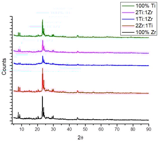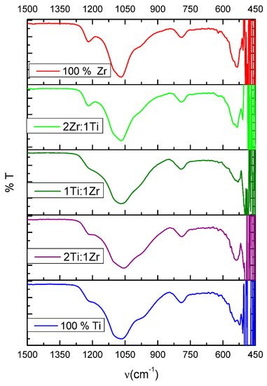 The peak at 450 cm−1 is attributed to the internal tetrahedral bending vibration of O-M-O (M = Ti or Zr Or Si) and peaks around 794 are attributed to the symmetrical stretching of external tetrahedral linkage [25]. In addition, the band at 1078 refers to internal bridging, while the one at 1230 refers to external bridging [26]. Furthermore, the more intense peak at 1230 could be an indication of changing the density of the framework [27]. From Figure 5, it observed that this peak becomes much more intense as the percentage of Zr increases, which is much more clear and sharp in 100% Zr.