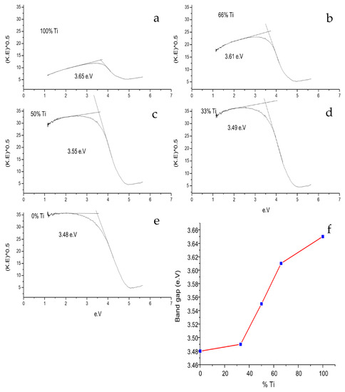 Kubelka–Munk method curves combined with a relation between percentage of Ti and band gap values: (a) 100% Ti; (b) 66%Ti; (c) 50% Ti; (d) 33%Ti; (e) 0 %Ti; (f) effect of %Ti on band gap.