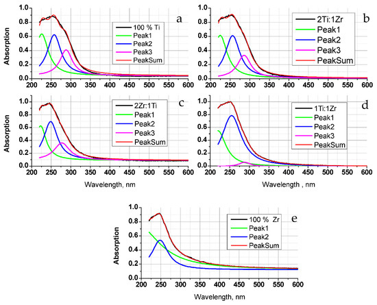 Deconvolution graphs of diffuse reflectance spectra: (a) 100% Ti; (b) 2Ti:1Zr; (c) 2Zr:1Ti; (d) 1Ti:1Zr; (e) 100%Zr.