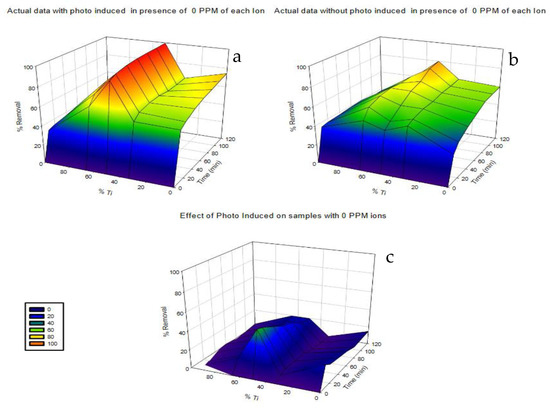 Three-dimensional curves of removal of 0 ppm ions with 10 ppm dye in the presence and absence of UV irradiation and the difference between curves: (a) under UV irradiation; (b) without UV irradiation; (c) two curves difference.