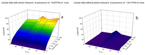 Three-dimensional curves of removal of 100 ppm ions with 10 ppm dye in the presence and absence of UV irradiation: (a) under UV irradiation; (b) without UV irradiation.