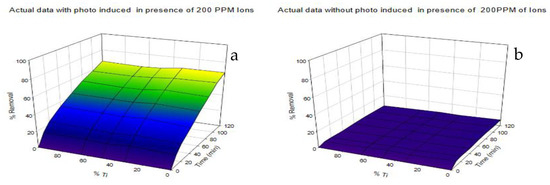 Three-dimensional curves of removal of 200 ppm ions with 10 ppm dye in the presence and absence of UV irradiation: (a) under UV irradiation; (b) without UV irradiation.
