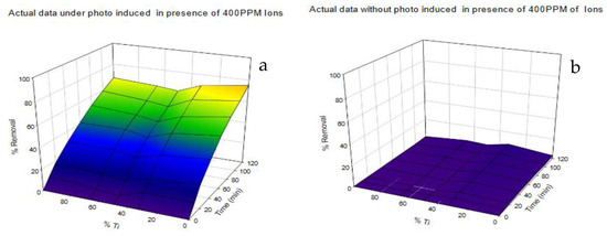 Three-dimensional curves of removal of 400 ppm ions with 10 ppm dye in the presence and absence of UV irradiation: (a) under UV irradiation; (b) without UV irradiation.