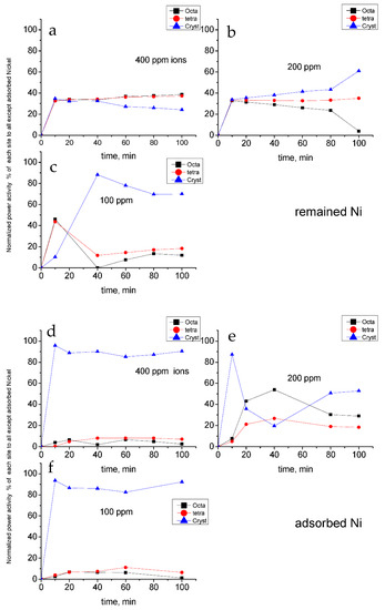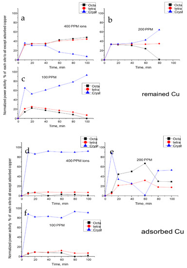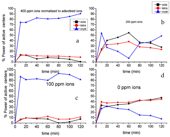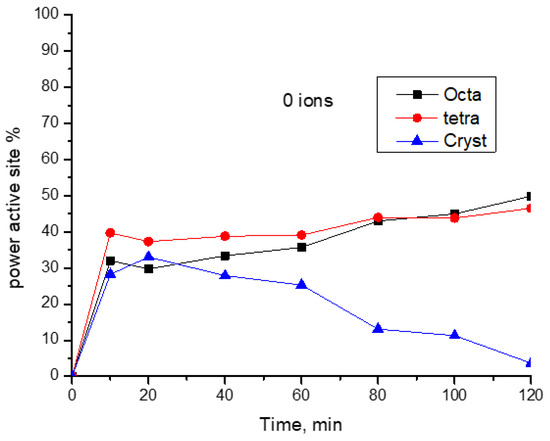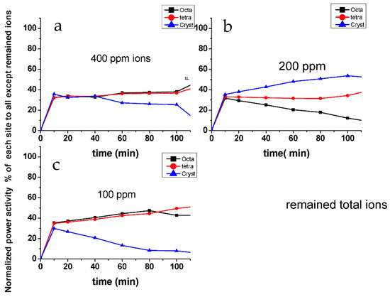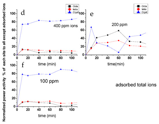 Figure 11 represents the effect of the remaining and adsorbed ions, respectively. From that figure, it could be concluded that the remaining ions nearly have no effects on the power activity of each site except for the 200 ppm ions samples where crystalline active sites are slightly increased by time with larger values than amorphous sites (tetragonal or octahedral). The other curves for 100 or 400 ppm ions are very similar to that corresponding to the curve with zero ions (Figure 12). In contrast, the adsorbed ions show high influence on crystalline part of active sites. Again, in the 200 ppm ion samples, the crystalline part power begins high; then, it is deactivated and then regenerated again with time. The adsorption effect curves are very similar to original power active centers map (Figure 12). This gives us the impression that the adsorbed ions are those that may play a major role especially on the crystalline part of the active site.