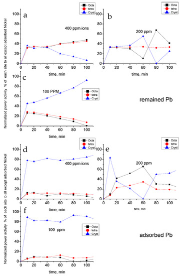 The effect of adsorbed ions and remaining ions on the power activity of each site: (a) 400 ppm remained; (b) 200 ppm remained; (c) 100 ppm remained; (d) 400 ppm adsorbed; (e) 200 ppm adsorbed; (f) 100 ppm adsorbed.