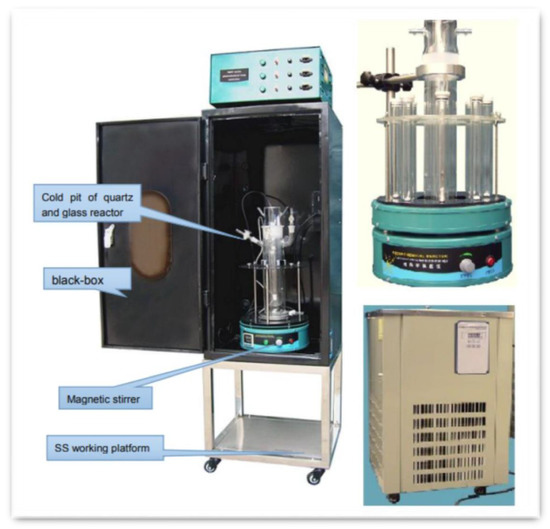 First, 100 mL of methylene blue of 10 ppm solution was mixed with 0.1 g of composite using a horizontal cylinder annular batch reactor. A mercury lamp (300 W) was used for irradiation of the photocatalyst. The photocatalytic reaction was carried out at room temperature. Different amounts of solutions are collected by time for analysis. Figure 17 shows the image of used instrument.
