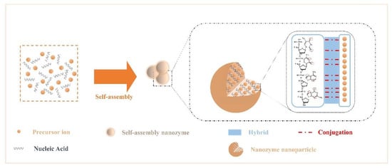 Here, we summarize the interactions among components. Recent studies have confirmed that the presence of various elements commonly found in nuclein—oxygen and nitrogen [55]. Nitrogen acts as an electron donor, and oxygen provides electron pairs, which can hybridize or covalently coordinate with single or multiple metal ion precursors (Figure 1); therefore, they can controllably modulate the enzyme activity and stability of nanoparticles [56,57,58,59,60]. In addition, Chen et al. [59] introduced nanocarrier mesoporous silica based on the study of noncovalent binding and discovered that the nucleic acid acted on the platinum particle precursor ion to produce a “reversible” masking effect at the active site.