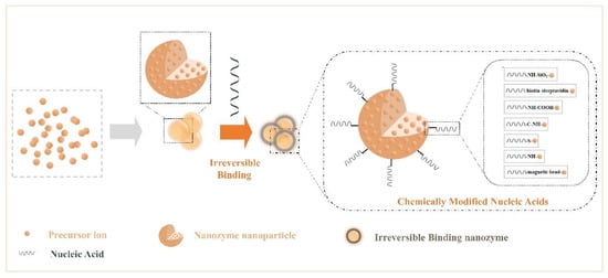 The irreversible combination of nucleic acids and nanozymes has rich functions, including high stability of modification performance, target specificity, flexibility of structure conversion, and diversity of interface components, enabling more effective construction of biosensors, which can be used to control enzyme activity and specifically recognize metal ions, small molecules, nucleic acids, and proteins [77,78,79]. Indeed, such an “Irreversible Binding Nanozyme” system possessed several inherent biosensing superiorities. Firstly, nanozymes have target affinity and recognition ability after chemically modifying nucleic acids. Additionally, nanozymes have the property of catalyzing optical signal enhancement of substrate so that the target can be optically detected by visual inspection. Moreover, the entire detection process does not require hours of molecular extraction or a few days of conventional culture. Here, we briefly list some reports on nanozymes directly modified with nucleic acids.