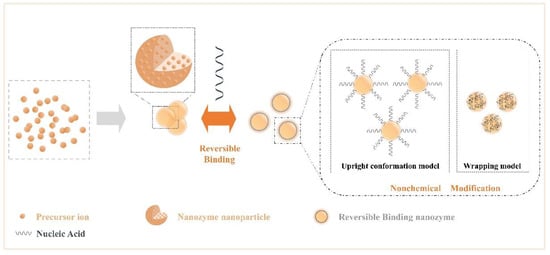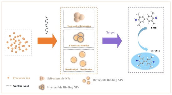Nucleic acid modulation of nanozymes is a key step in energy conversion events. Studies have shown that nucleic acids can change the size, shape, composition, surface modification, and state of NPs through biological, chemical, and physical effects [51,52,53,54]. Here, we scientifically discuss the construction of three types of crosstalk between nanozymes and nucleic acids: (nanozyme precursor ion)/(nucleic acid) self-assembly, nanozyme-nucleic acid irreversible binding, and NP-nucleic acid reversible binding.