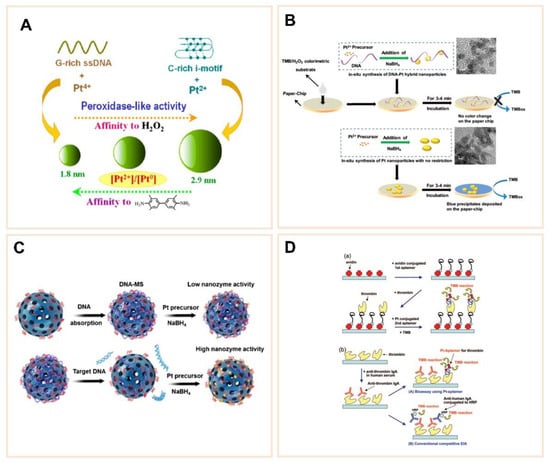 Nonmodified nucleic acid modulated single metal precursor ions. Higuchi et al. [60] synthesized a thrombin aptamer-Pt nanozyme complex through the covalent coordination of lone-pair electrons on the base with Pt2+. It was interesting that no functional groups, including biotin, thiol, etc., were used to modify the aptamer, while at the same time, the enzyme-mimicking activity of the NPs was perfectly combined with the specific recognition ability of the aptamer (Figure 5D). Meanwhile, its Km was comparable with that of hemin-G4 [73,74,75]. This work led to three conclusions: first, smaller nanozyme complexes had higher enzyme activity; second, enzyme active sites tended to be located on DNA-Pt complexes rather than on independent Pt atoms after coordination; and third, stronger coordination binding forced higher enzyme activity.