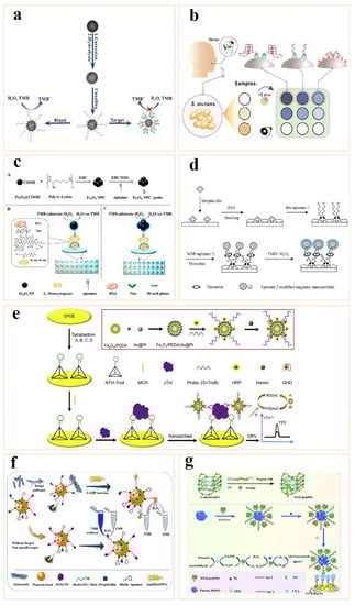 Second, the functionalized aptamer improved the energy conversion efficiency. For example, Zhang et al. [64] conjugated biotinylated nucleic acids to streptavidin-modified Fe3O4 nanozymes. This work described two types of nucleic acids: nonfunctionalized and G4-hemin functionalized nucleic acid binding aptamers (Figure 6b). Among them, the functionalized enzyme not only increased the specific recognition ability for Streptococcus mutans but also enhanced the enzyme activity and recognized a target concentration in saliva as low as 12 CFU/mL. However, Zhang et al. [65] conjugated carboxylated Fe3O4 nanozymes to aminoated nucleic acids and converted the nucleic acid-specific binding events to Listeria monocytogenes into a colorimetric signal output (Figure 6c) with a visual limit of 5.4 × 103 CFU/mL (Table 1). In another example, Wu et al. [69] used polyhistidine peptides that underwent a Michael addition through cysteine to combine with sulfo-SMCC-ylated G-quadruplex/heme (hCG). Pd nanozymes and carcinoembryonic antigen aptamers (CEA Apt) were combined with toluidine blue. The bioconjugated probe hGQ-peptide/CEA Apt/Pd NPs specifically recognized CEA with femtogram-level sensitivity (Figure 6g). Sun et al. [67] used in situ chemical oxidation polymerization to prepare a Au-PDA-Fe3O4 magnetic nanocomposite, fixed the thiolated G-rich sequence and HRP on the nanocomposite through metal thiol bonds, and then added hemin (Figure 6e). Due to the triple enzymatic activity of the nanomimic enzyme, G4-Hemin, and HRP, recognition of the target cardiac troponin I was possible at the picogram scale. The downside was the complicated functional design of the nucleic acid components, which was not an expected property of the otherwise excellent detection tools.
