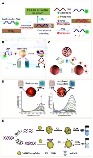 Nucleic acid physically blocked the interaction between the nanozyme and substrates and modulated the biochemical energy conversion. Wang et al. [93] compared the different interface effects between nucleic acids and MnO2 and between nucleic acids and GO and found that, unlike nucleic acid adsorption to GO through aromatic ring accumulation and hydrogen bonding forces, nucleic acids bind MnO2 through phosphate backbone coordination. The interface between the anionic polyelectrolyte nature of the nucleic acid itself and MnO2 generates an electrostatic force, which increases the spatial distance between the substrate and the nanozyme MnO2 (steric hindrance) and shuts down the activity of the nanozyme (Figure 7A). Interestingly, after complementary strands were added, these nucleic acids could compete to bind to the single strands on MnO2, which was desirable for biological detection events. In addition, MnO2 was dissolved by thiols to release the adsorbed nucleic acid to achieve the detection of glutathione (LOD 383 nM), which cannot be achieved by other metal oxides (such as Fe3O4, CeO2, TiO2), and this property can be used in targeted delivery.