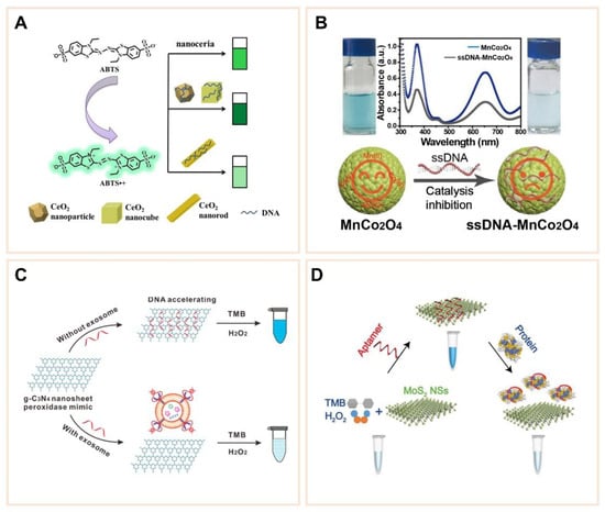 For the “reversible binding nanozyme”, the changes in the active sites of the interface components were used to modulate energy conversion events: (A) An interaction occurred between the nucleic acid and NP interface, the active sites exposed by NPs of different morphologies were different, and the energy of the enzyme-catalyzed process was modulated to change the optical signal. Reprinted with permission from reference [107]. Copyright 2018, Institute of Physics. (B) The aptamer shut down the active site of MnCo2O4, inhibiting the enzymatic process and converting into a weak optical signal. Reprinted with permission from reference [120]. Copyright 2018, Elsevier. (C) Nucleic acid enhanced the ability of the g-C3N4 nanosheet to obtain electrons, increased the number of active sites, and increased the conversion into an optical signal. Reprinted with permission from reference [28]. Copyright 2017, The American Chemical Society. (D) MoS2 NSs (nanosheets) adsorbed ssDNA, increased the enzyme activity, and enhanced the optical signal. Reprinted with permission from reference [121]. Copyright 2020, Royal Society of Chemistry.