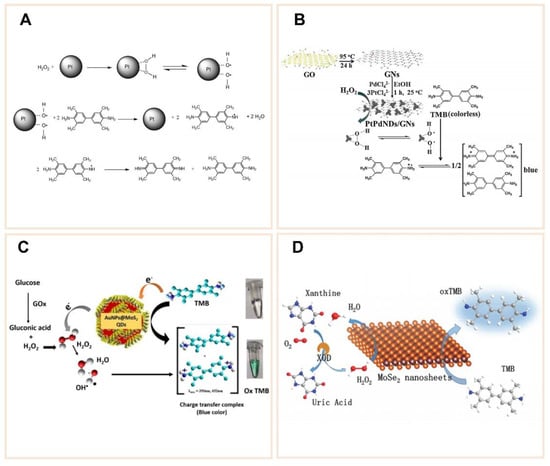 It has long been reported that free radicals can promote enzyme activity. Kitajima et al. [122] and Mochida et al. [123] proposed a free radical reaction chain in which Pt NPs trigger the cleavage of O-O bonds to generate highly active hydroxyl radicals, promote H2O2 to obtain electrons, and ultimately promote H2O2 oxidation and decomposition. Ma et al. [124] proposed that based on the free radical chain reaction triggered by accelerated electron transfer, the speed of electron transfer was accelerated, which led to the formation of the catalytic intermediate hydroxyl radical (Figure 9A). Chen et al. [125] further expanded on this research and proposed two points of view. First, PtPd bimetallic nanosheets increase Pt reactivity. Second, the large surface area structure of the nanosheets increases the reaction contact area of Pt. In addition to the changes in the structure of the reactants, the mechanism of the free radical chain reaction [122,123] was also shown to be correct. In short, some researchers agree that Pt acts as an intermediate reactant (electron acceptor transition carrier) in the catalytic process [126,127] to promote the activation of H2O2 into hydroxyl radicals, and then, hydroxyl radicals and TMB undergo redox reactions on the surface of the nanosheets (Figure 9B).