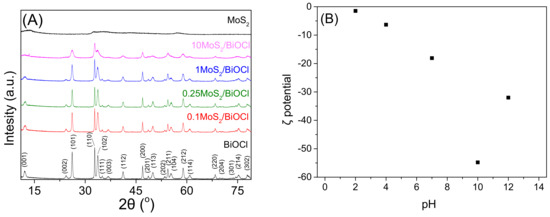 Figure 1 shows the XRD patterns of pure BiOCl and MoS2 samples as well as of the composite MoS2/BiOCl photocatalysts. For BiOCl, the diffraction peaks can be indexed to the well-crystallized tetragonal phase of BiOCl (JCPDS 6-249), in accordance with previous studies [35,39]. Specifically, the peaks located at 24.2°, 32.5°, 33.6°, and 46.8° are, respectively, indexed to (002), (110), (102), and (200) crystal planes of tetragonal BiOCl. It is observed that with the addition of MoS2 to these peaks gradually became less sharp, indicating that the primary crystallite size becomes smaller. These phenomena are more evident for the samples containing 1 and especially 10 wt.% MoS2. The primary crystallize size of the synthesized photocatalysts are shown on Table 1. It is observed that crystallite size reduces from 26 nm for pure BiOCl to 10 nm for 10 wt.% MoS2/BiOCl. The XRD pattern of pure MoS2 matches well with the JCPDS card 9-312 for MoS2 and its crystallite size was found to be equal to 1 nm. Table 1 also presents the specific surface area of all samples. It appears that specific surface area of BiOCl increases with the addition of MoS2. Zeta potential measurements (Figure 1B) revealed that the 0.25 wt.% MoS2/BiOCl surface is negatively charged throughout pH scale. In addition, at more basic conditions, the negative charge increased.