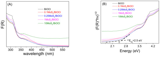 UV–visible diffuse reflectance spectroscopy was adopted in order to investigate the optical properties of all the synthesized materials (Figure 3A). It is observed that BiOCl has an absorption threshold at λ ~450 nm, which remains practically intact after the addition of relatively small quantities of MoS2. However, 10 wt.% MoS2/BiOCl sample is characterized by improved absorption at the visible part of the solar spectrum. Furthermore, the band gap of the photocatalysts was defined from Tauc plots (Figure 3B). The pure BiOCl band gap was found to be equal to 2.5 eV, in accordance with previous studies [39]. Moreover, despite the fact that composite samples show greater absorption in higher wavelengths, their band gap value is not practically altered after MoS2 addition.