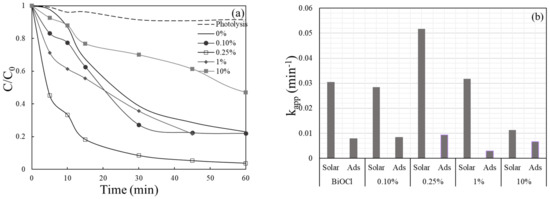 Preliminary tests were carried out to evaluate the photocatalytic activity of BiOCl and to examine whether the heterojunction of BiOCl with MoS2 could improve its photocatalytic activity for VLS removal in ultrapure water (UPW) under simulated solar irradiation. Experiments were conducted at 1000 mg/L catalyst concentration. As seen from Figure 4a, the addition of small amounts of MoS2 up to 0.25 wt.% increases the photocatalytic activity of BiOCl; complete degradation of VLS was observed after 60 min, where only 80% VLS was degraded at the same time in the case of pure BiOCl. However, a further increase in the amount of MoS2 results in a decrease in VLS degradation rate. The best outcomes were confirmed for the catalyst loaded with 0.25 wt.% MoS2, where 0.5 mg/L VLS was degraded after 60 min. It is worth mentioning that photolysis alone does not participate to VLS degradation, as only 10% 0.5 mg/L VLS was degraded after 60 min. To estimate reaction rates, the degradation of VLS is considered to follow a pseudo-first order kinetic expression, (Equation (1)) [40]: