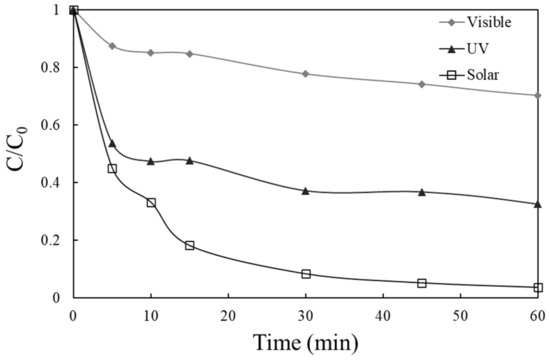 Additional tests were performed to find out if the type of irradiation affects the destruction of 0.5 mg/L VLS in the presence of 1000 mg/L 0.25 MoS2/BiOCl, and results are presented in Figure 7. After 60 min of irradiation, 70% and 30% removal of VLS was achieved under UV and visible irradiation, respectively, showing that, under solar irradiation, VLS degradation occurs to a significant extent, with kapp = 0.0517 min−1, which is 4 times higher than kapp = 0.0131 min−1 under UV irradiation. As a result, the ultraviolet portion of the solar spectrum tends to have a significant impact on VLS degradation.