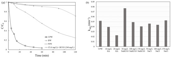 (a) Effect of water matrix on 0.5 mg/L VLS degradation with 1000 mg/L 0.25 MoS2/BiOCl under solar irradiation. (b) Constant apparent rates of the degradation of 0.5 mg/L VLS in UPW spiked with different constituents.