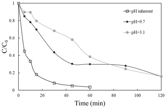 Additional tests were conducted to assess the impact of initial pH values on 0.5 mg/L VLS decomposition. The inherent value of 5.5 in UPW was adjusted to acidic (pH = 3.1) and basic (pH = 9.7) conditions and results are depicted in Figure 9. As it can be observed, after 60 min of irradiation VLS was degraded at inherent pH, while only 60% VLS was degraded under acidic and basic conditions. Moreover, at acidic and basic conditions computed constant rates was decreased at 0.0155 and 0.0144 min−1, respectively. The observed reduced SMX removal in basic environment could be associated with the growing electrostatic repulsion between 0.25 MoS2/BiOCl and SMX since both are negatively charged. This is verified by photocatalyst’s zeta potential measurements (Figure 1B), showing its surface negative charge at pH > 9. On the other hand, under acidic conditions, electrostatic attraction would be expected to lead to improved SMX degradation. The fact that this was not observed is probably due to catalyst dissolution at acidic pH.