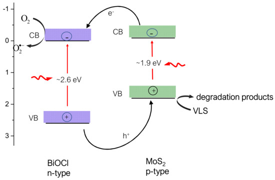 As demonstrated in Scheme 1, photogenerated electrons and holes are produced over BiOCl and MoS2 under solar irradiation. Because of the relative position of their conduction (CB) and valence band (VB), when making contact, electrons will be moved to the CB of BiOCl, and holes will be transferred in the VB of MoS2 [39,41]. At the same time, p–n heterojunctions are created at the interfaces of the p-type MoS2 and the n-type BiOCl semiconductors, thus hindering their recombination [42,43]. Photogenerated species can now start redox reactions for VLS degradation. VLS can be oxidized directly by photogenerated holes, while photogenerated electrons reduce absorbed O2 resulting in the formation of more reactive species (i.e., superoxide anions) which can also contribute to VLS oxidation.