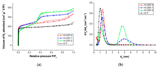 Figure 2a shows the N2 adsorption-desorption isotherms for H-USY-0, H-USY-1, H-USY-2, and H-Y. H-Y exhibits a type-I isotherm, typical for microporous solids. The H-USY-0 sample combines type-I and IV isotherms [26]. The adsorption branch reflects adsorption in the micropores at the lowest pressures but also adsorption in small mesopores, as indicated by the uptake between 0.01 < p/p0 < 0.2.