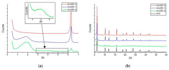 The powder XRD (X-ray diffraction) patterns at low and wide angles of H-Y, H-USY-0, H-USY-1, and H-USY-2 are shown in Figure 3. The characteristic Y zeolite framework peaks are observed for all samples at wide angles. The peak intensities of H-USY-1 and H-USY-2 decrease with respect to the parent H-USY-0. This is due to a loss of crystallinity, which can be (semi-)quantified, and the values are given in Table 2. The exact positions of the XRD peak depend on the unit cell parameters a0, which are also listed in Table 2. A slight shift to higher angles is observed for the mesoporous samples. According to the Fichtner-Schmittler equation, this leads to an increased framework Si/Al ratio. This might be due to localized hydrolysis of Al–O bonds, leading to the removal of aluminum from the framework [28]. This phenomenon is less significant on H-USY-1 than on H-USY-2.