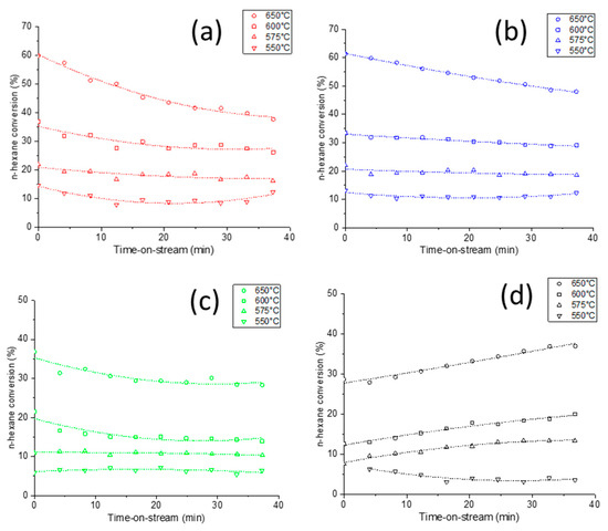 Conversion of n-hexane on (a) H-USY-0, (b) H-USY-1, (c) H-USY-2, and (d) H-Y at 550 (▼), 575 (▲), 600 (●), and 650 °C (■). Reaction conditions: catalyst 0.1 g; Pn-hexane = 9 kPa; W/FnC6,0 = 3.9 gcat h/molnC6; temperature 550–650 °C.