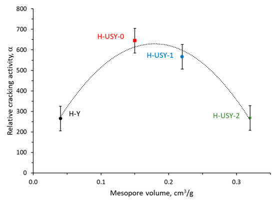 To calculate the relative cracking activity α of the H-Y and H-USY zeolites, a value of 0.012 s−1 for the rate constant for n-hexane cracking over an amorphous silica-alumina was estimated, according to the reaction conditions reported in [11]. The conversion data were extrapolated to 811 K with the corresponding activation energies. Figure 6 shows the relative cracking activity as a function of the mesopore volume. A volcano-like curve is observed. An optimum activity appears around a mesoporosity of 0.15, corresponding to the H-USY-0 sample. This is likely due to a trade-off between the increasing acidity and/or rate of molecular transport in the mesoporous materials and the decrease in the number of Brønsted sites with increasing mesoporosity.