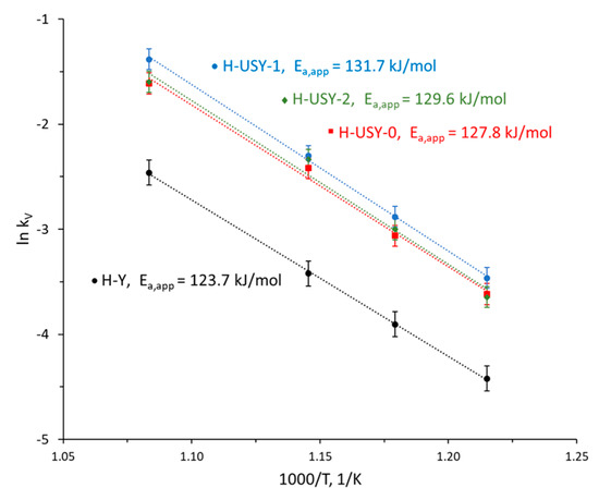 The value of the rate constant for the microporous H-Y sample, on the other hand, is approximately two times smaller, and the activation energy is significantly lower (123.7 vs. 129.7 ± 2 kJ/mol) than for the H-USY samples. There can be several reasons for the lower activity of H-Y compared to the H-USY samples.