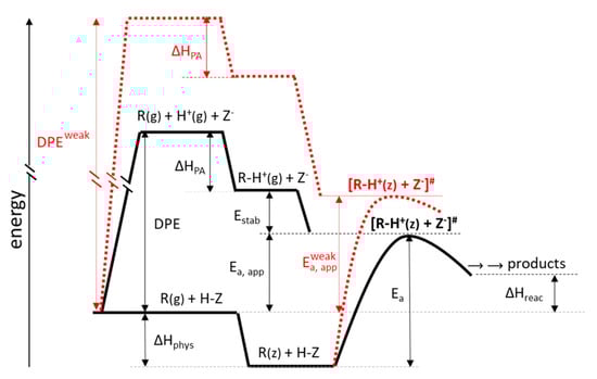 A different independent path can be chosen to reach the same transition state since the diagram concerns thermodynamical quantities. This path involves the DPE, the proton affinity (ΔHPA), and the stabilization energy (Estab) [19,21,22,23]. It follows from the diagram in Figure 8 that the sum of the apparent activation energy (Ea,app), the stabilization energy, and the proton affinity is equal to the DPE. Thus, an increase in the DPE, which corresponds to a weaker acid strength (DPEweak), and assuming constant stabilization energy, will lead to an increase in the apparent activation energy (as well as the intrinsic barrier). This is indicated by the red dotted lines in Figure 8.