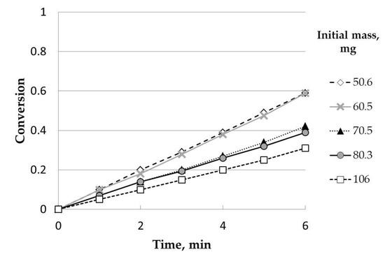 Regarding the initial mass of heather charcoal, five experiments, with initial weights of 106, 80, 70, 60, and 50 mg, were carried out. Figure 1 shows the main results obtained. According to previous studies, the presence of external diffusional effects in a bed of particles coulddepend on the H/2R ratio, where H is the height of the bed and R is the bed radius [21,22]. The value from which the diffusional effects are negligible depends on many characteristics (the experimental facility used, raw material, etc.). As a consequence, it is necessary to resort to testing to determine this value, that is, an initial mass value below which these effects are negligible. In this case, as in previous studies, the radius of the bed was constant, and the increase in the mass of the sample implied an increase in height [21]. The procedure followed to determine this value consisted in calculating the conversion at different reaction times for all the experiments carried out. This way, it was observed that, for a given reaction time, conversion increased as the initial mass decreased. This trend stopped for initial mass values below 60 mg. Thus, conversion values were similar for the experiments carried out at 60 and 50 mg. As a consequence, the value chosen to carry out the rest of the experiments was around 50 mg.