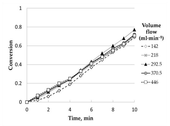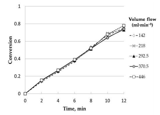 As can be seen in Figure 6, the influence of volumetric flow on conversion can be considered negligible, as all the curves represented were similar. Considering these results, the optimum volumetric flow was 275 mL·ml−1, assuming that for this value, there is no diffusional effect.