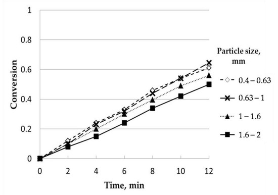 Four different particle sizes were tested, in ranges within 0.4–0.63, 0.63–1.00, 1.00–1.60, and 1.60–2.00 mm. The particle size profile was the following: 0.4–0.63 mm, 16.72%; 0.63–1.00 mm, 25.43%; 1.00–1.60 mm, 32.99%; 1.60–2.00 mm; 18.96%. The remaining percentage (5.9%) was related to particle sizes below 0.40 mm and above 2.00 mm, which were removed. The influence observed was almost negligible. Except for the experiment carried out with the highest range of particle size, conversion seemed to be independent of this variable, with similar values. Under these circumstances, the particle size selected was in the range of 0.63–1.00 mm. According to the literature, the effect of particle size on gasification rate was described as a complex process with different effects depending on the particle size range selected [23,24] due to the difference in the properties of the raw materials used. Generally, an increase in reactivity was observed as the particle size was smaller, which could be explained by the increase in the specific surface area [25]. Although this fact is also dependent on the porosity of charcoals, as there are also studies where the trend observed was the opposite, that is, with a decrease in reactivity as the particle size was smaller [26]. On the other hand, from a theoretical point of view, and according to ideal models for gas-solid reactions, the dependence between the time required for total conversion of the particle and its ratio was proportional to Rn, where n can vary from 0 to 2. In the section devoted to the kinetic study, the corresponding expressions will be commented on.