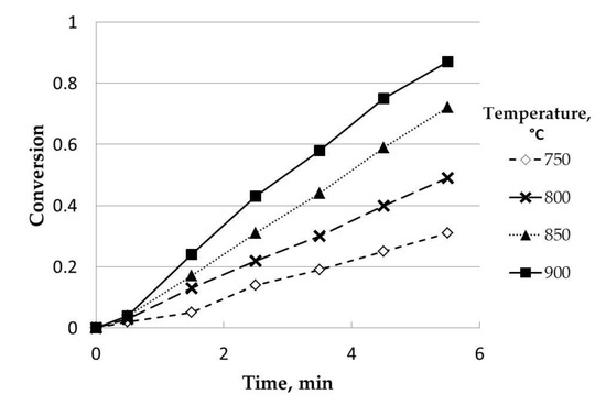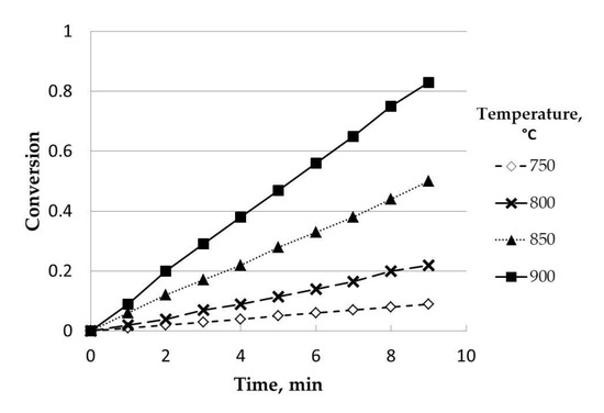 Four experiments at different temperatures, 750, 800, 850, and 900 °C, were carried out. As can be seen in Figure 4, the influence of this variable was positive for all the experimental ranges studied. Thus, the conversion for a certain reaction time was higher as the temperature increased. This dependence was expected and agrees with the classical relationship between reaction rate and temperature. As other authors pointed out, the gasification rate is highly dependent on temperature, showing a higher reactivity and shorter reaction times [14].