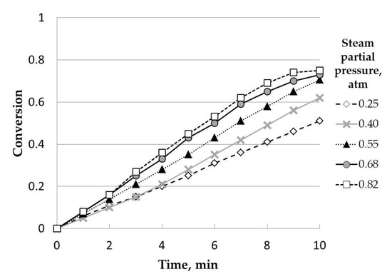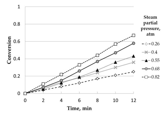 Five experiments at different steam partial pressures (0.26, 0.40, 0.55, 0.68, and 0.82 atm) were carried out, as can be observed in Figure 5. This variable had a positive effect on all the variability range. Thus, the highest conversion values were obtained at 0.82 atm due to the increase in reaction rate when the concentration of a reagent (in this case, steam) was higher, which implies an increase in rate with concentration. This way, as pointed out by other authors, a higher steam partial pressure indicates a greater steam quantity available to react, increasing the gasification rate [14].